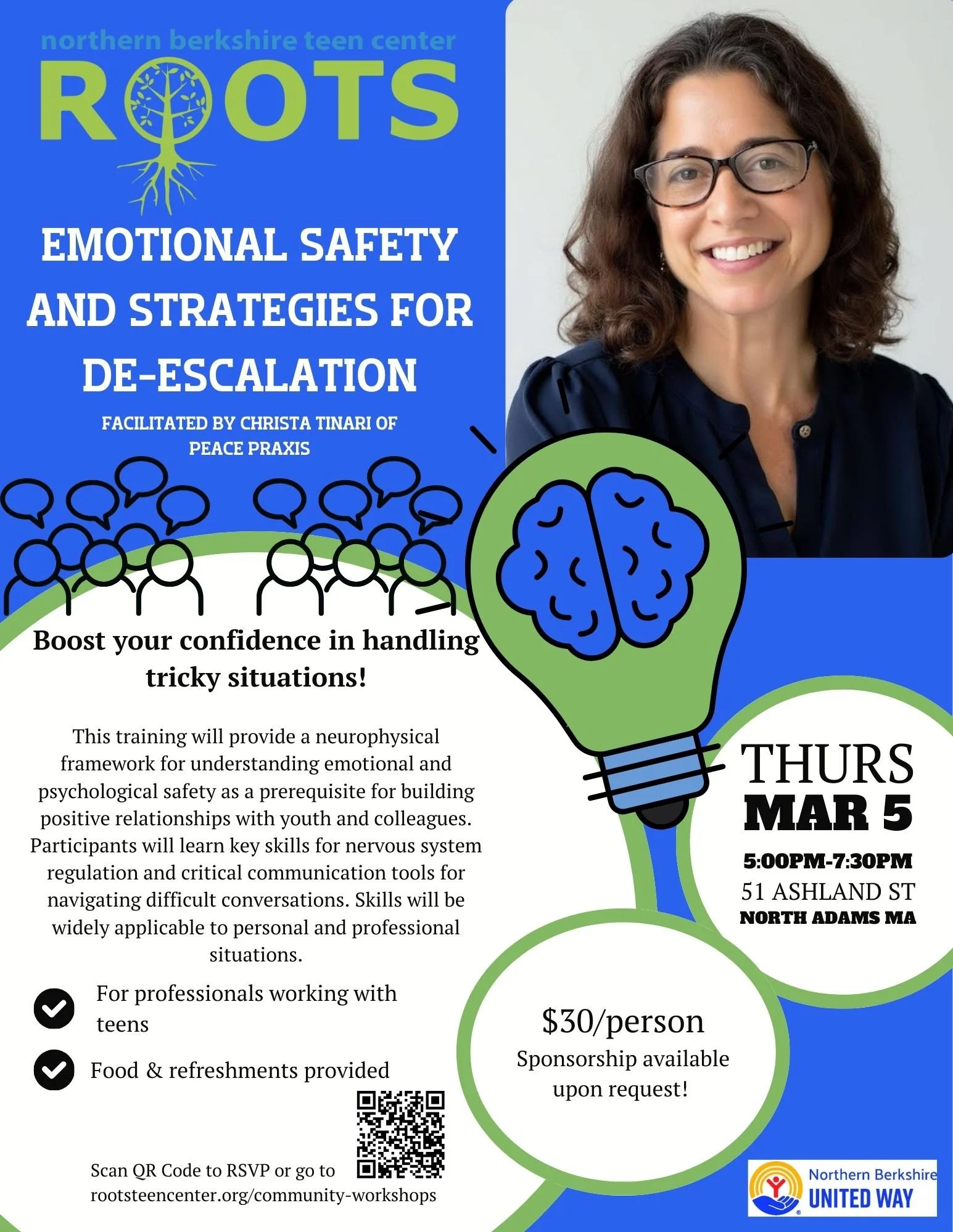 Ms. Tinari is an educator, author, and community builder who facilitates positive social change through equipping people with the skills they need to build a more just and compassionate world. She brings a wealth of practical and strategic experience in youth empowerment, programmatic and staff development, and organizational leadership to her current work. As an international trainer with SEE Learning and the Community Resiliency Model, Ms. Tinari has served thousands of people in over 40 countries. Ms. Tinari resides in Clarksburg with her family. She supports local efforts that contribute to improving the quality of life in the Berkshires.